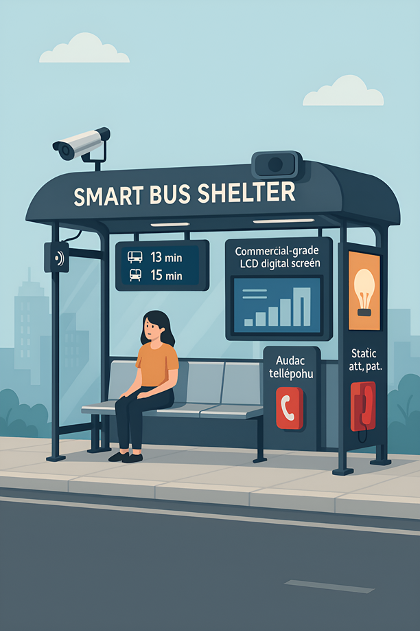 The Smart Bus Shelter is a fully integrated urban infrastructure unit designed to offer a safe, smart, and convenient waiting environment for public transport users. It is equipped with a powder-coated MS or galvanised steel frame, a UV-stabilised polycarbonate or FRP curved roof, and an elevated RCC platform with anti-skid tiles and universal ramp access. Inside, it features stainless steel seating for passengers, ACP or toughened glass side and back panels for protection and branding. The shelter includes an outdoor P6 LED display for real-time bus route and arrival updates, a commercial-grade LCD digital screen for cloud-based advertising, and static advertisement panels with optional LED backlighting. For safety and monitoring, it has dual CCTV cameras (inside and outside), connected to a central NVR with cloud sync, and a vandal-proof public emergency telephone linked to the ICCC. A cloud-enabled speaker system allows real-time public announcements, while the hybrid power system—comprising EB mains and a 100W solar panel with MPPT charge controller and 75Ah battery—ensures uninterrupted operation. All smart systems are connected via an industrial-grade 4G LTE router with SIM-based broadband and VPN support, fully integrated into the city’s ICCC platform. This smart shelter combines intelligent design, sustainability, digital communication, and revenue generation in one modern urban solution.